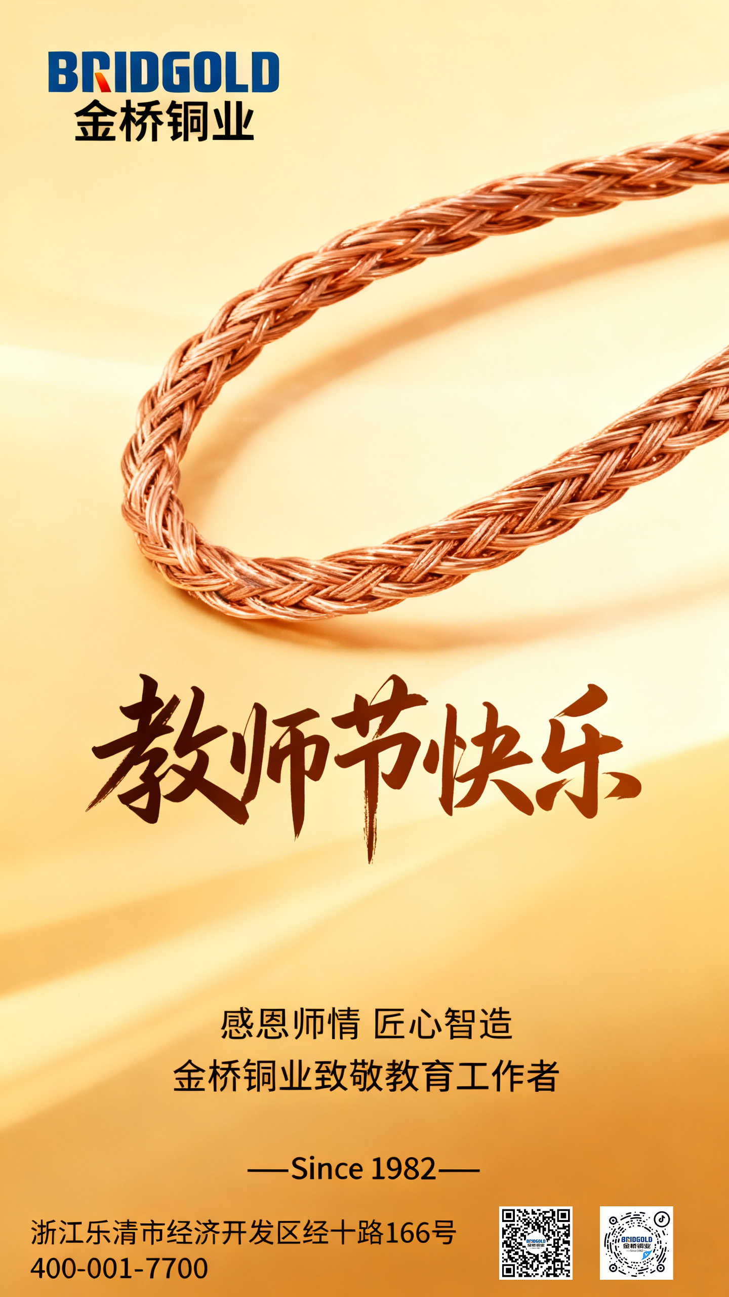 師者如燈,照亮前行之路;銅線似橋,連接信賴與未來。多年來,金橋銅業(yè)在銅加工行業(yè)深耕不輟,以技術(shù)創(chuàng)新推動產(chǎn)品升級,就像老師們不斷更新教學理念,用更生動、更高效的方式啟迪智慧。我們深知,優(yōu)質(zhì)的銅編織線是企業(yè)發(fā)展的“生命線”,優(yōu)秀的教師是社會進步的“基石”。在這個充滿感恩的日子里,金橋銅業(yè)不僅要向老師們表達誠摯祝福,更要以“師者匠心”自勉,持續(xù)為客戶提供更優(yōu)質(zhì)的銅編織線產(chǎn)品與服務(wù)。